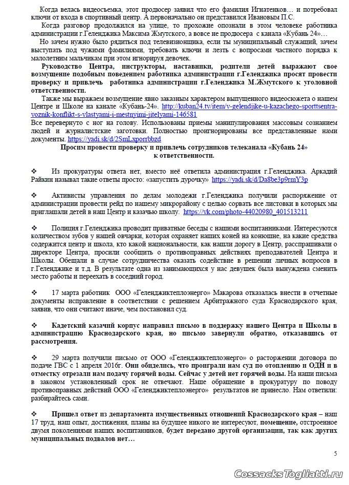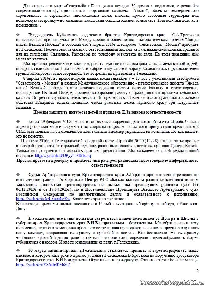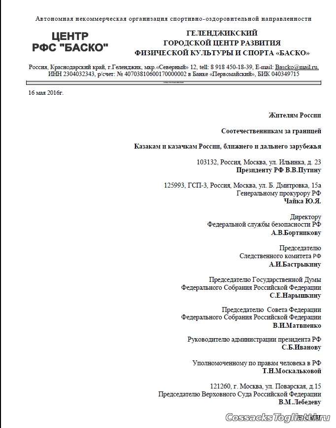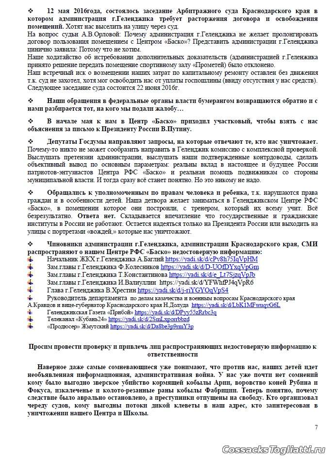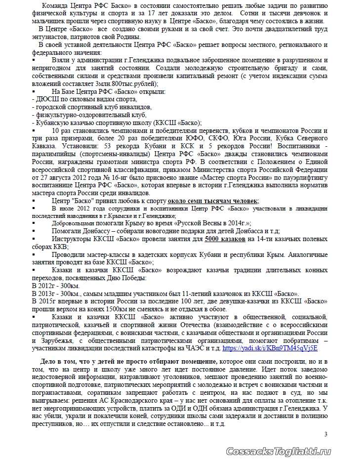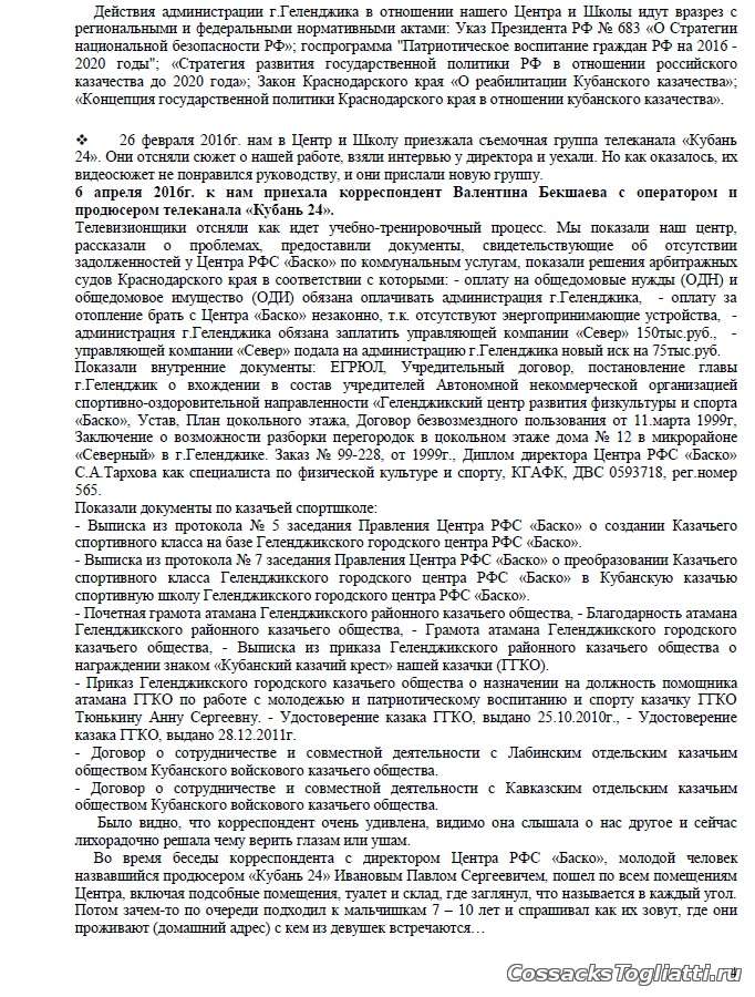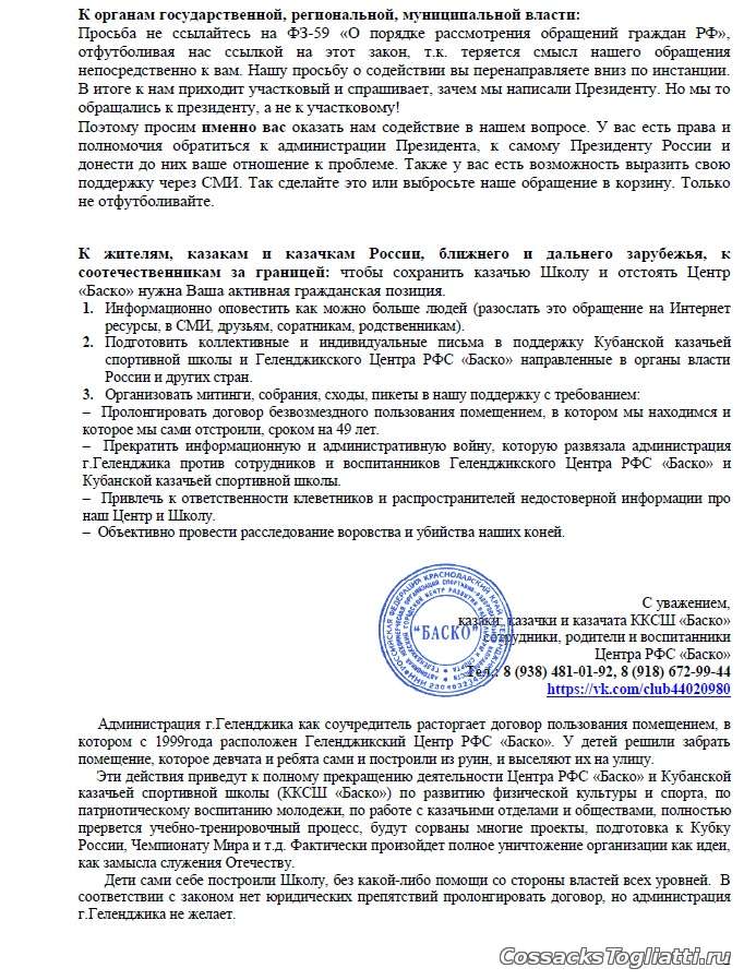 Редакция ИА КАЗАКИТОЛЬЯТТИ просит правоохранительные органы России проверить на достоверность приведённые в этом письме факты противоправных действий со стороны администрации г.Геленджик по отношению к ККСШ «Баско»!