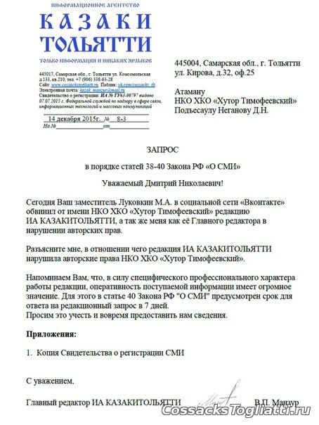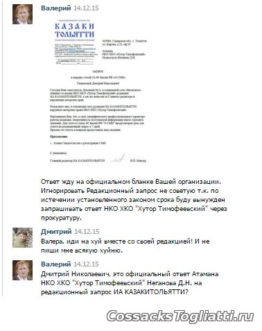 Однако, дальше больше. Только когда эта тема поднялась и вместо атамана ХКО "Хутор Тимофеевский", поддержку начало оказывать Информагентство “КАЗАКИТОЛЬЯТТИ” на различных информационных ресурсах, атаман пошёл на попятную.