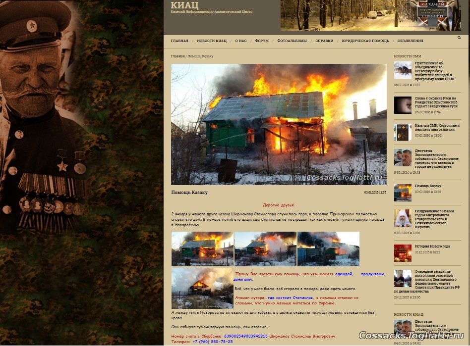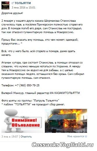 У друга нашего главного редактора, казака Ширманова Станислава, в посёлке Приморском полностью сгорел его дом. В пожаре погиб дядя, сам Станислав не пострадал, так как отвозил гуманитарную помощь в Новороссию. На земле Русской принято в горе помогать и если сгорел дом, то строили новый всем селом. Наше удивление было безгранично, когда мы узнали, что атаман Хуторского Казачьего Общества "Хутор Тимофеевский", в котором и числится Ширманов Станислав, отказал в помощи казаку.