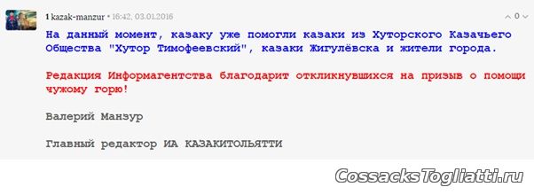 Вопрос только в том, помог бы атаман ХКО "Хутор Тимофеевский" своему казаку, если бы вопрос о данной проблеме не был бы освещён в кругах широкой общественности силами Информагентства “КАЗАКИТОЛЬЯТТИ”?